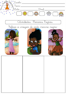 Logo abaixo vocês encontrarão atividades e um projeto muito bacana para educação infantil que abordam a história das Meninas Negras, elaborados pela Andreza do Blog Meus Trabalhos Pedagógicos. As atividades desenvolvem a coordenação motora, cores, letras, números, formas geométricas e musicalização.